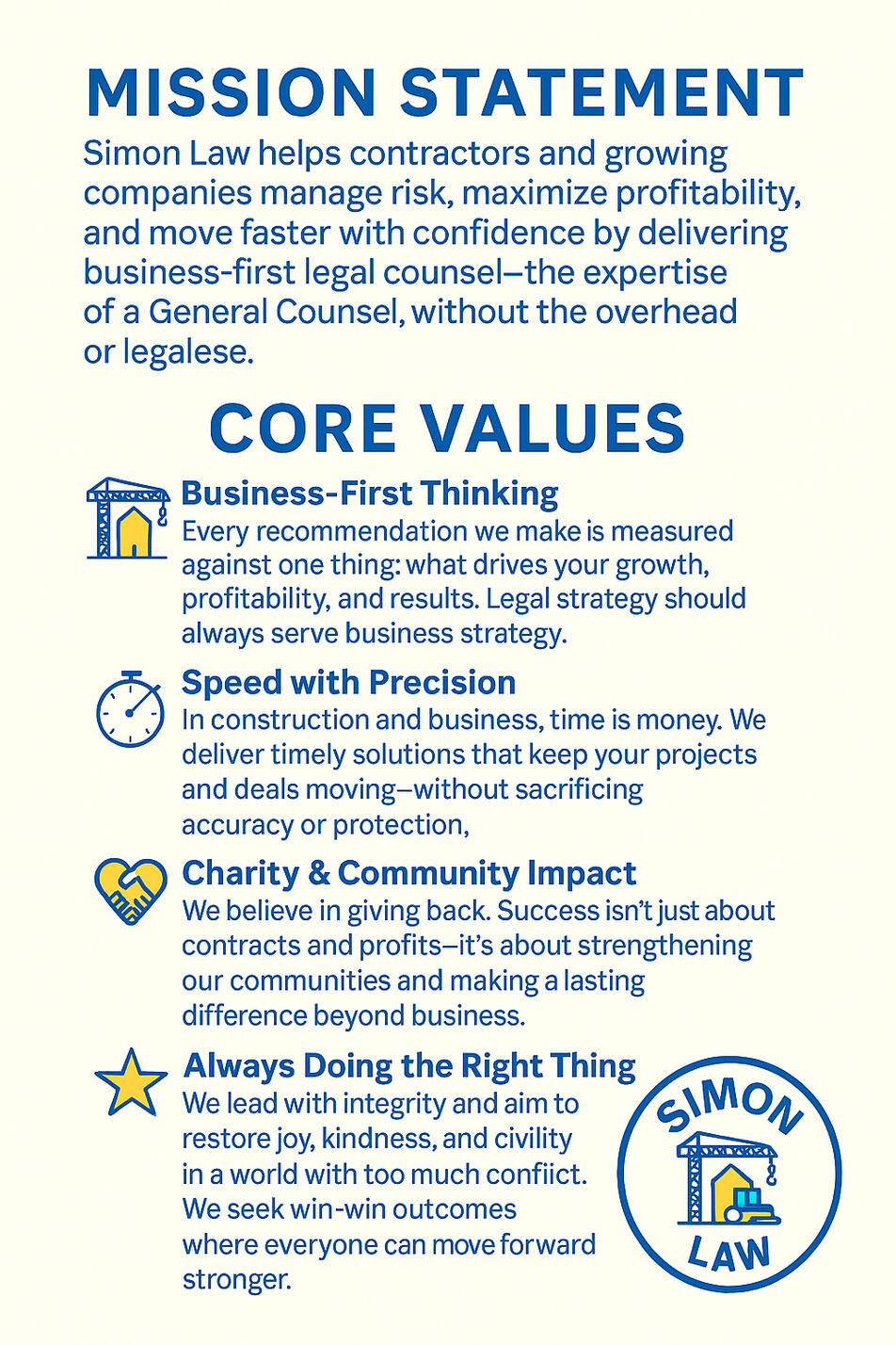 At Simon Law, I keep it simple: business-first legal advice that’s clear, fast, and built for real-world results. No legalese or long memos; I help you get things done. One of my favorite mentors, Scott Parker, always said "Tell me what time it is. Don't tell me how to build a clock." It took some time, but I've learned how to quickly tell people what time it is.With a multitude of experience in construction, contracts, and business law, I know how to protect your business without slowing it down. I also represent individuals in personal injury and car-wreck cases, applying the same practical judgment, personal attention, and respect to claims that matter just as much as the businesses behind them.